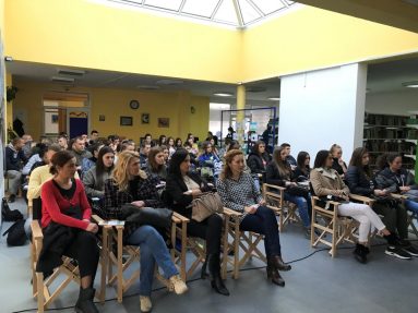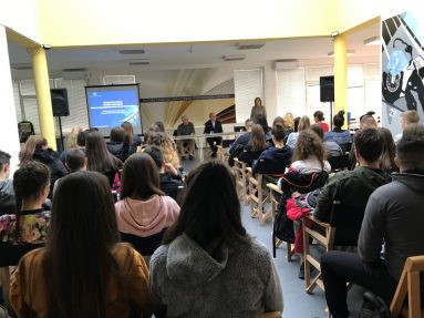 Ученици Економско-трговинске школе са директорком Драганом Пауновић и професоркама са економске групе предмета и практичне наставе Александром Обрадовић и Јасном Петровић, били су гости ове трибине.
