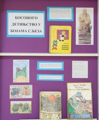 Изложбом Босоного детињство у бојама сљеза, на трећем спрату Библиотеке, упознајемо младе читаоце са главним мотивима којима се аутор водио док је писао за децу. Део поставке су и Ћопићеве књиге које се налазе у фонду Дечјег одељења.