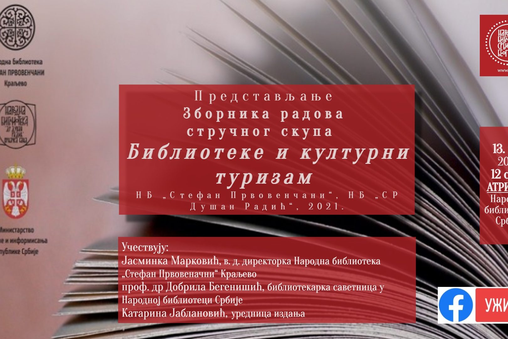 У Атријуму Народне библиотеке Србије, у петак, 13. маја, уприличено је представљање зборника стручних радова „Библиотеке и културни туризам” (НБ „Стефан Првовенчани”, НБ „Др Душан Радић”, 2021).