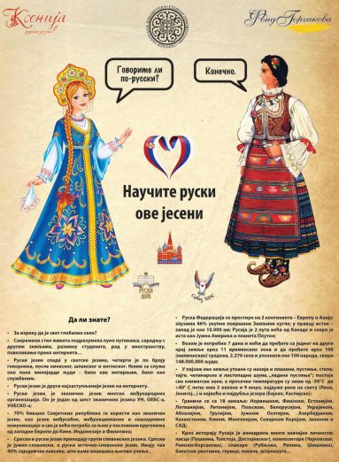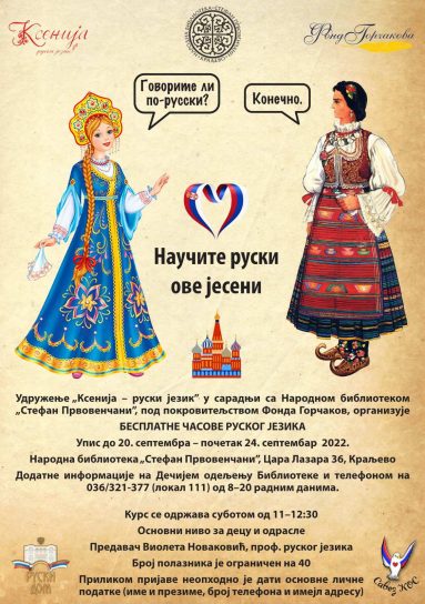 Удружење „Ксенија – руски језик“ у сарадњи са Народном библиотеком „Стефан Првовенчани“, под покровитељством Фонда Горчаков, организује БЕСПЛАТНЕ ЧАСОВЕ РУСКОГ ЈЕЗИКА. Упис до 20. септембра – почетак 24. септембар 2022. Народна библиотека„Стефан Првовенчани“, Цара Лазара 36, Краљево. Додатне информације на Дечијем одељењу Библиотеке и телефоном на 036/321-377 (локал 111) од 8-20 радним данима. Курс се одржава суботом од 11 -12:30. Основни ниво за децу и одрасле. Предавач Виолета Новаковић, проф. руског језика. Број полазника je ограничен на 40. Приликом пријаве неопходно je дати основне личне податке (име и презиме, број телефона и имејл адресу)