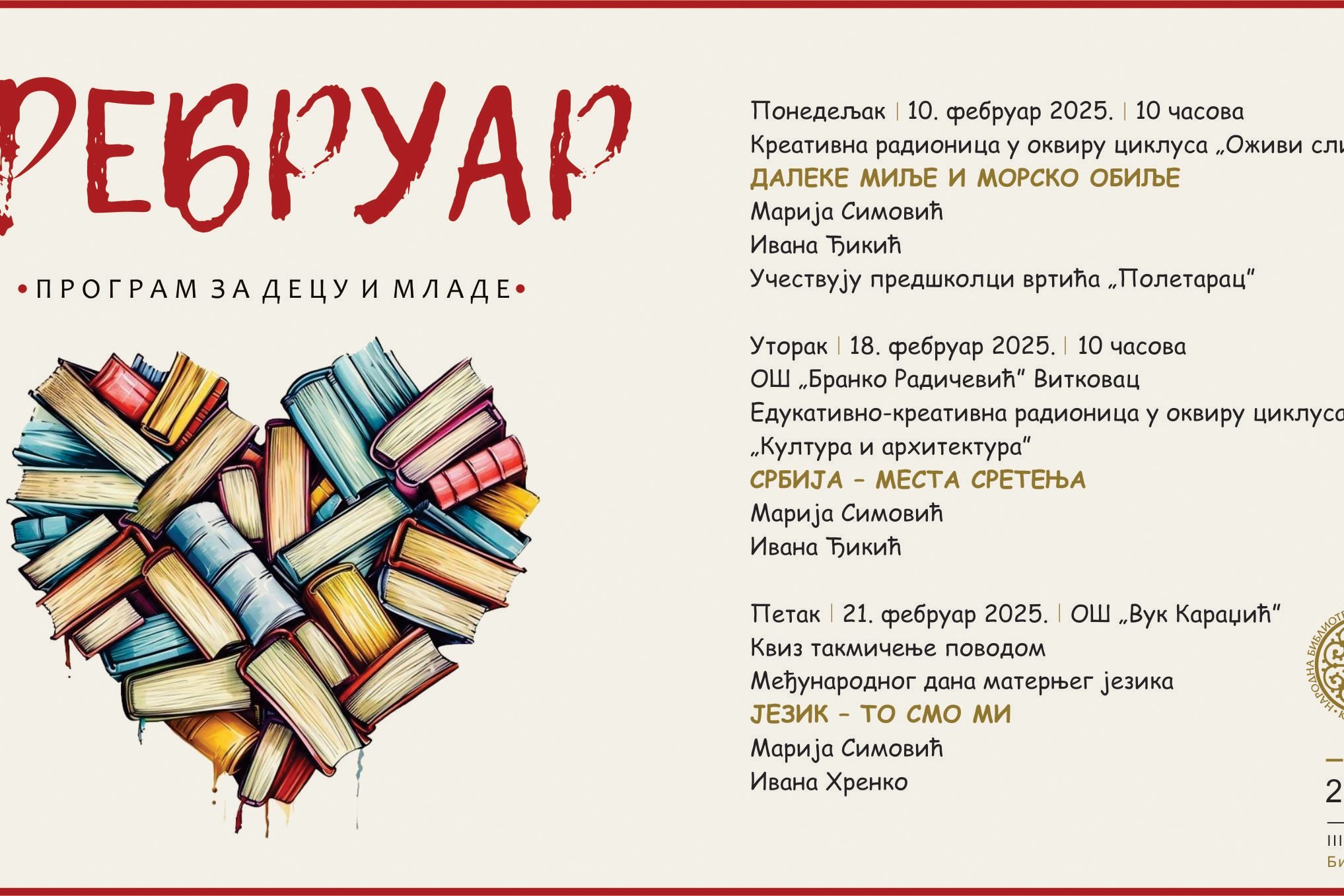 У уторак, 18. фебруара 2025. године, у 10 часова, у Основној школи „Бранко Радичевић” Витковац, у оквиру новопокренутог едукативно-креативног програмског циклуса „Култура и архитектура”, намењеног деци основношколског узраста, библиотекари Народне библиотеке „Стефан Првовенчани” реализоваће радионицу под насловом „Србија ‒ места сретења”. Примењујући изузетно делотворан модел учења кроз игру, библиотекари ће кроз састављање слагалица са цртежима најзначајнијих архитектонских здања у Србији, деци представити градитељско културно наслеђе Србије.