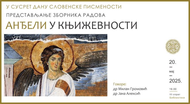 У сусрет Дану словенске писмености Представљање зборника Анђели у књижевности др Милан Громовић, уредник др Јана Алексић У уторак, 20. маја 2025. године, у 19 часова, у Народној библиотеци „Стефан Првовенчани” Краљево, у сусрет Дану словенске писмености, биће приређено представљање Зборника радова „Анђели у књижевности” којим су издавачки обједињени научни прилози представљени на Међународном скупу