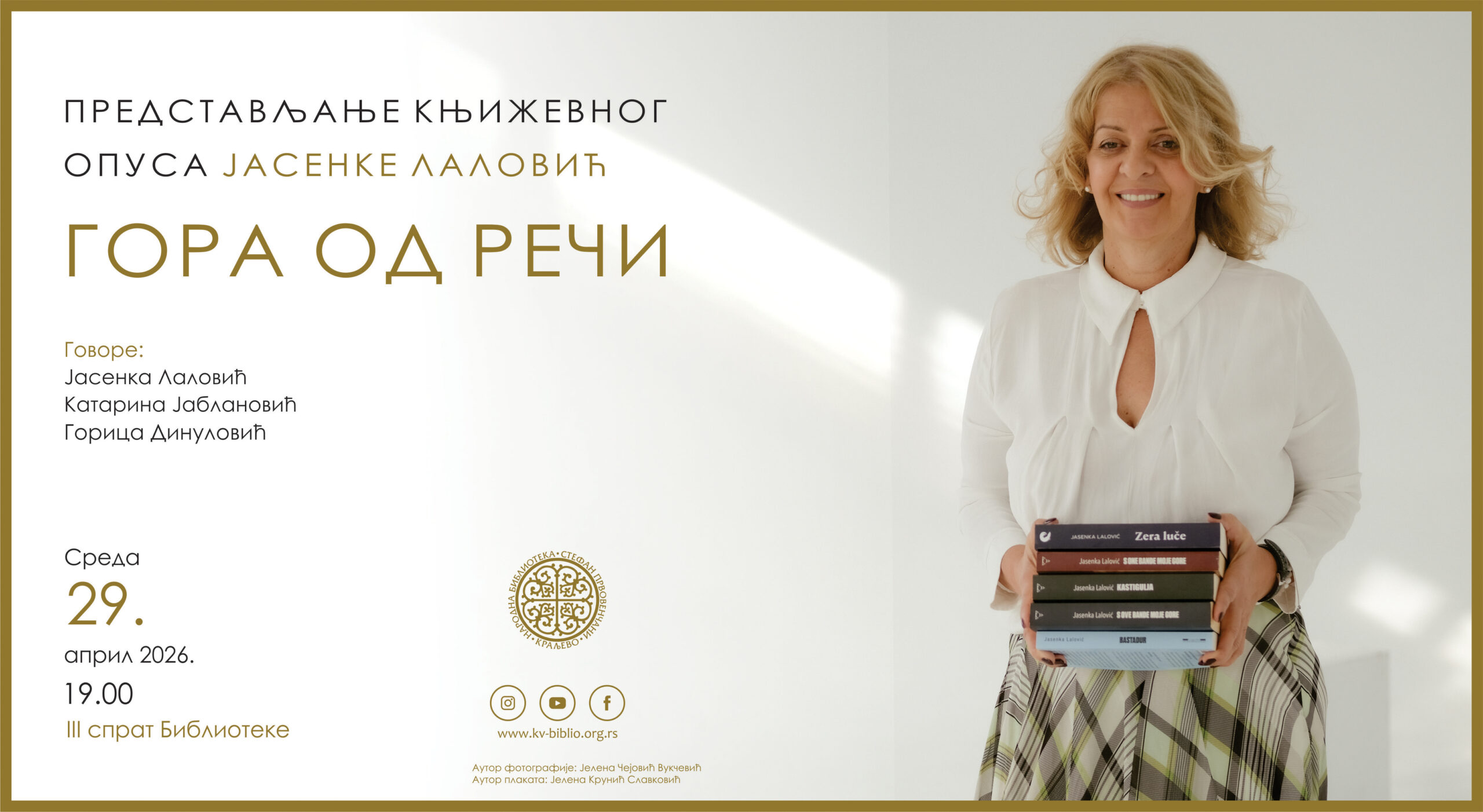 У среду, 29. априла 2026. године, у 19 часова, у краљевачкој библиотеци ће бити уприличено представљање књижевног опуса Јасенке Лаловић, једне од најчитанијих савремених ауторки домаће литертуре.