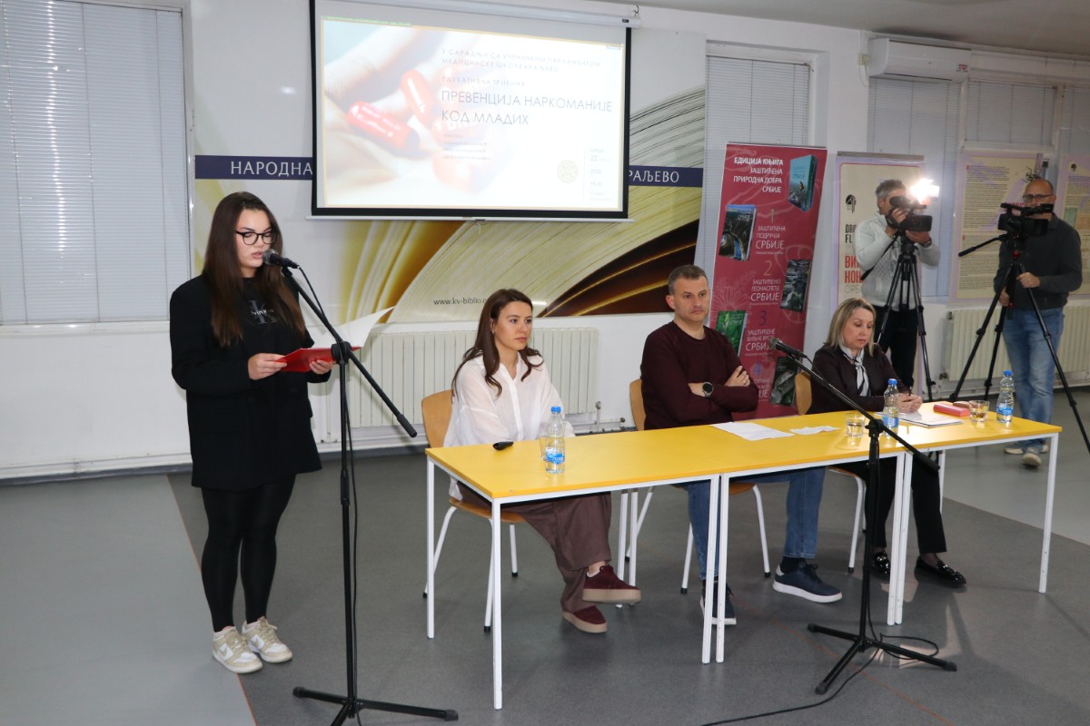 На иницијативу Ученичког парламента Медицинске школе Краљево, у Народној библиотеци „Стефан Првовенчани” реализована је едукативна трибина за млађу популацију под називом „Превенција наркоманије код младих”. Програм је отворен поздравним речима директорке краљевачке Медицинске школе, Биљане Бојанић, која је упутила похвалу Ученичком парламенту за изузетно ангажовање у организовању едукације вршњака у вези са важним друштвеним и здравственим темама. У разговору о превенирању наркоманије код младих као једној од све присутнијих и изузетно претећих појава за здравље младих, говорили су Бојана Максимовић, тужилац Вишег јавног тужилаштва у Краљеву, Иван Милашиновић, капетан полиције у Полицијској управи Краљево, и др Катарина Бишевац са Клинике за психијатријске болести „Др Лаза Лазаревић”.