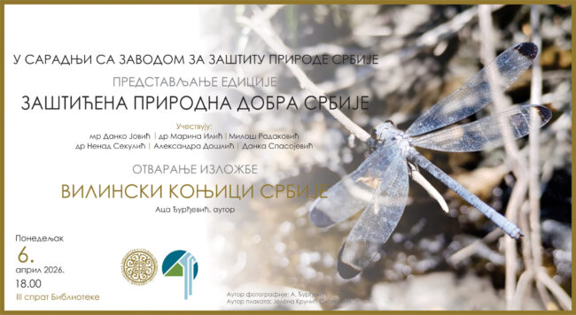 Понедељак, 6. април 2026. године, 18 часова У сарадњи са Заводом за заштиту природе Србије Представљање едиције Заштићена природна добра Србије мр Данко Јовић, др Марина Илић, Милош Радаковић, др Ненад Секулић, Александра Дошлић, Данка Спасојевић Отварање изложбе Вилински коњици Србије Аца Ђурђевић, аутор У понедељак, 6. априла 2026. године, у 18 часова, у