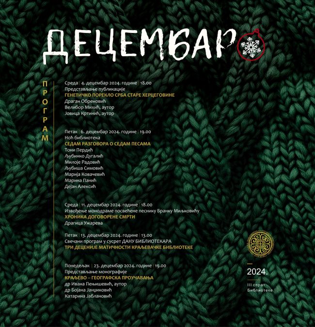 Представљање песничког опуса за децу Писац чита деци у библиотеци Дејан Алексић У уторак, 17. децембра 2024. године, у 18 часова, на Дечјем одељењу библиотеке биће приређен књижевни програм за децу под називом „Писац чита деци у библиотеци”, у оквиру којег ће Дејан Алексић, један од најомиљенијих савремених песника за децу, окупљеним малишанима представити свој