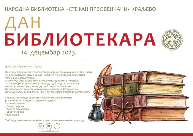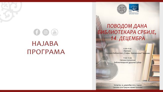 ПРОГРАМИ ДЕЦЕМБАР 2023. ОПИС Петак, 1. децембар 2023. године, 11 часова У петак, 1. децембра 2023. године, у 11 часова, биће одржан четврти овогодишњи семинар у оквиру програма редовног стручног усавршавања у библиотечко-информационој делатности. Реч је о програму „Библиотечка статистика и њено вођење у складу са законском регулативом и међународним ISO стандардима за
