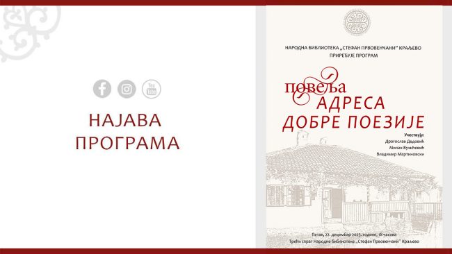 У петак, 22. децембра 2023. године, у 18 часова, у Народној библиотеци „Стефан Првовенчани” Краљево, под називом „Повеља – адреса добре поезије”, биће уприличено представљање „Повељиних” аутора и песничких књига објављених у 2023. години. Дуги низ година Издавачка делатност НБ „Стефан Првовенчани” – „Повеља” један је од најзначајнијих домаћих издавача песничких књига. Посебан углед, у