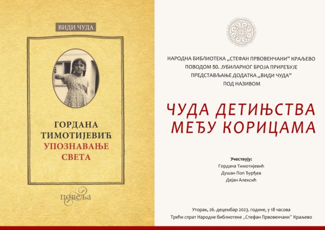 У уторак, 26. децембра 2023. године, у 18 часова, у краљевачкој библиотеци, под називом „Чуда детињства међу корицама”, биће приређено представљање додатка „Види чуда”, поводом 50. јубиларног броја. Од 2006. године, основној свесци књижевног магазина „Повеља” придружена су и два додатка од којих се један зове „Види чуда”. Реч је о књижевном сепарату намењеном аутобиографским