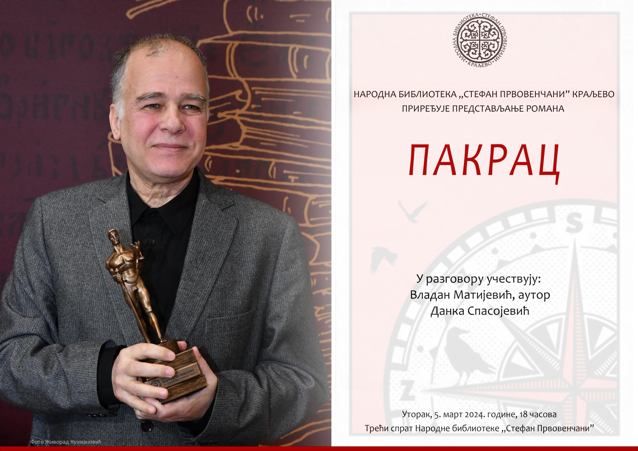 У краљевачкој библиотеци приређено је представљање романа „Пакрац” Владана Матијевића, једног од најзначајнијих савремених српских романописаца, вишеструко награђиваног за досадашње литерарно стваралаштво најугледнијим књижевним признањима, којима је почетком ове године придружена и награда „Београдски победник” управо за поменути роман као најбољи у 2023. години. Обједињујући елементе психолошког романа приповеданог у форми унутрашњег монолога, затим црте