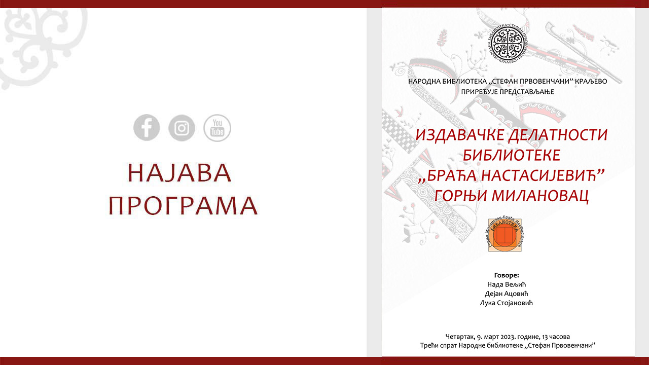 У четвртак, 2. марта 2023. у НБ „Стефан Првовенчани” уприличено је књижевно вече с Даницом Вукићевић, актуелном добитницом НИН-ове награде. Представљајући њен награђен роман Унутрашње море, говорили су критичарка и чланица НИН-овог жирија Милена Ђорђијевић, издавач и уредник Реља Дражић и сама ауторка. На врло посећеном програму, отворене су теме у вези с хибридним облицима